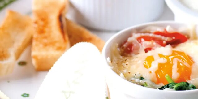 Zapečená vajíčka se špenátem, šunkou a sýrem