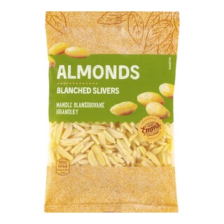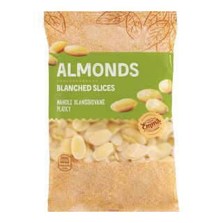 MANDLE blanšírované. Výrobek může obsahovat ARAŠÍDY, jiné SKOŘÁPKOVÉ PLODY, SEZAM a OXID SIŘIČITÝ.