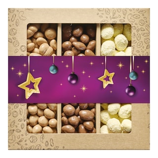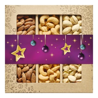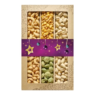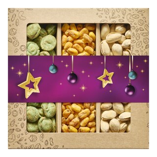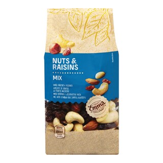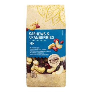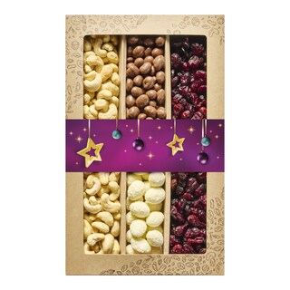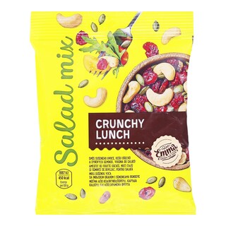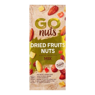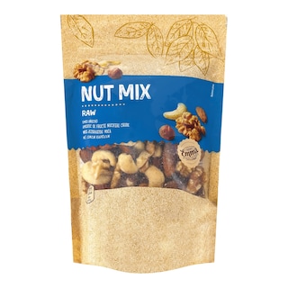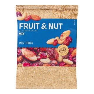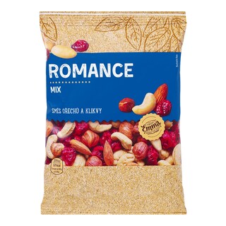Směs pražených a solených ořechových jader a sušeného částečně slazeného ovoce, rebarbory a banánových lupínků.
