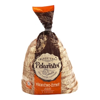 PŠENIČNÁ mouka, voda, PŠENIČNÝ kvas 11 % (voda, PŠENIČNÁ mouka, PŠENIČNÁ kvasná kultura), řepkový olej, droždí, jedlá sůl s jódem (jedlá sůl, jodičnan draselný), cukr, přípravek [PŠENIČNÁ mouka, PŠENIČNÁ a JEČNÁ sladová mouka, sladový extrakt (JEČNÝ slad, voda), látka zlepšující mouku kyselina L-askorbová], regulátor kyselosti: octany sodné.
