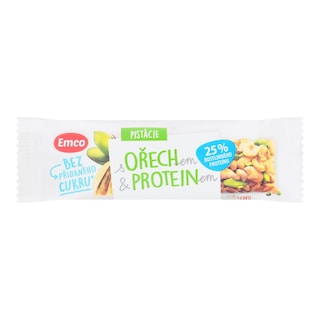 Proteinová směs (SÓJOVÝ proteinový izolát, SYROVÁTKOVÝ proteinový koncentrát, SÓJOVÉ vločky), glukózo- fruktózový sirup, MLÉČNÁ čokoláda 14 % (cukr, kakaové máslo, kakaová hmota, sušené plnotučné MLÉKO, emulgátory SÓJOVÝ lecitin a E 476, vanilkový extrakt), tekutý invertní cukr, rostlinný tuk (palmojádrový, palmový, bambucký), krém s příchutí vanilky (cukr, palmový a bambucký olej, sušená SYROVÁTKA, sušené odstředěné MLÉKO, emulgátor SÓJOVÝ lecitin, aroma, barvivo E 160c), PISTÁCIE 3,5 %, kokos (kokos, antioxidant OXID SIŘIČITÝ), emulgátor řepkový lecitin, rýžový extrudát (rýže, emulgátor E 471), L-glutamin, aroma, antioxidant směs přírodních tokoferolů, zahušťovadlo guarová guma, směs koncentrátu světlice barvířšké a extraktu spiruliny, barvivo karamel, nikotinamid, riboflavin. Může obsahovat stopy ARAŠÍDŮ a SEZAMU.