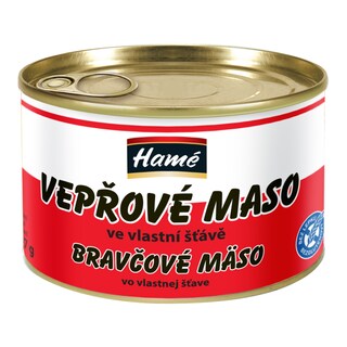 Masová konzerva. Vepřové maso ve vlastní šťávě.