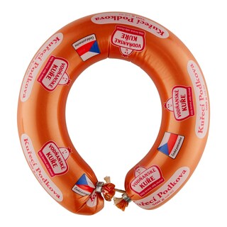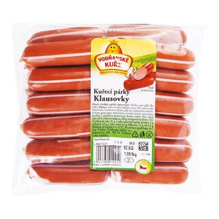Kuřecí strojně oddělené maso 66%, pitná voda, kuřecí kůže, bramborový škrob, jedlá sůl, stabilizátor trifosforečnany, směs koření, extrakty koření, antioxidant kyselina L-askorbová, konzervant dusitan sodný.
