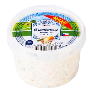 MAJONÉZA (řepkový olej, voda, cukr, sůl, VAJEČNÝ žloutek sušený, zahušťovadlo: guma guar, xanthan), lahůdkový salám (vepřové a hovězí maso, voda, bramborový škrob, sůl, konzervant: dusitan sodný, stabilizátor: trifosforečnany, koření, cukr, antioxidant: kyselina L-askorbová, extrakt koření), sterilovaná zelenina (okurka, kukuřice, CELER, feferonky, kvasný ocet lihový, cukr, sůl), cukr, sůl, konzervant: benzoan sodný, regulátor kyselosti: kyselina citronová. Může obsahovat stopy RYB, MLÉKA, HOŘČICE.